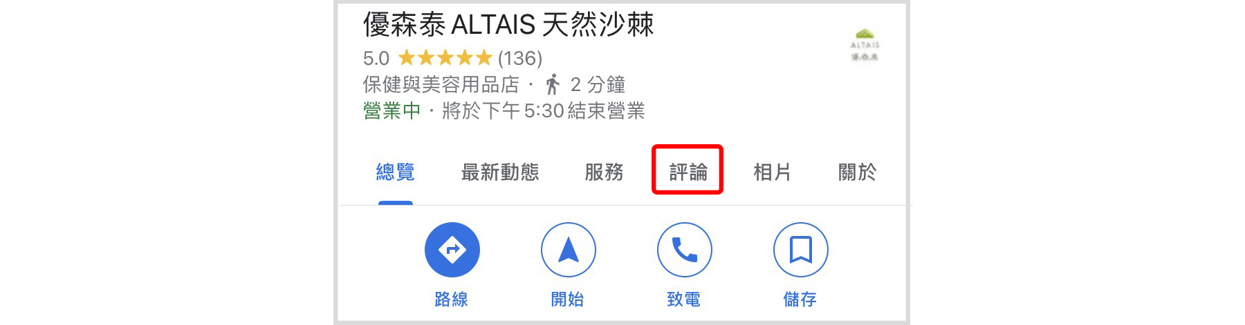 Step 1. 點擊 https://g.page/ALTAISTW/review?rc 或Google搜尋優森泰點擊「評論」按鈕 。(需登入Google帳戶才能填寫評論)