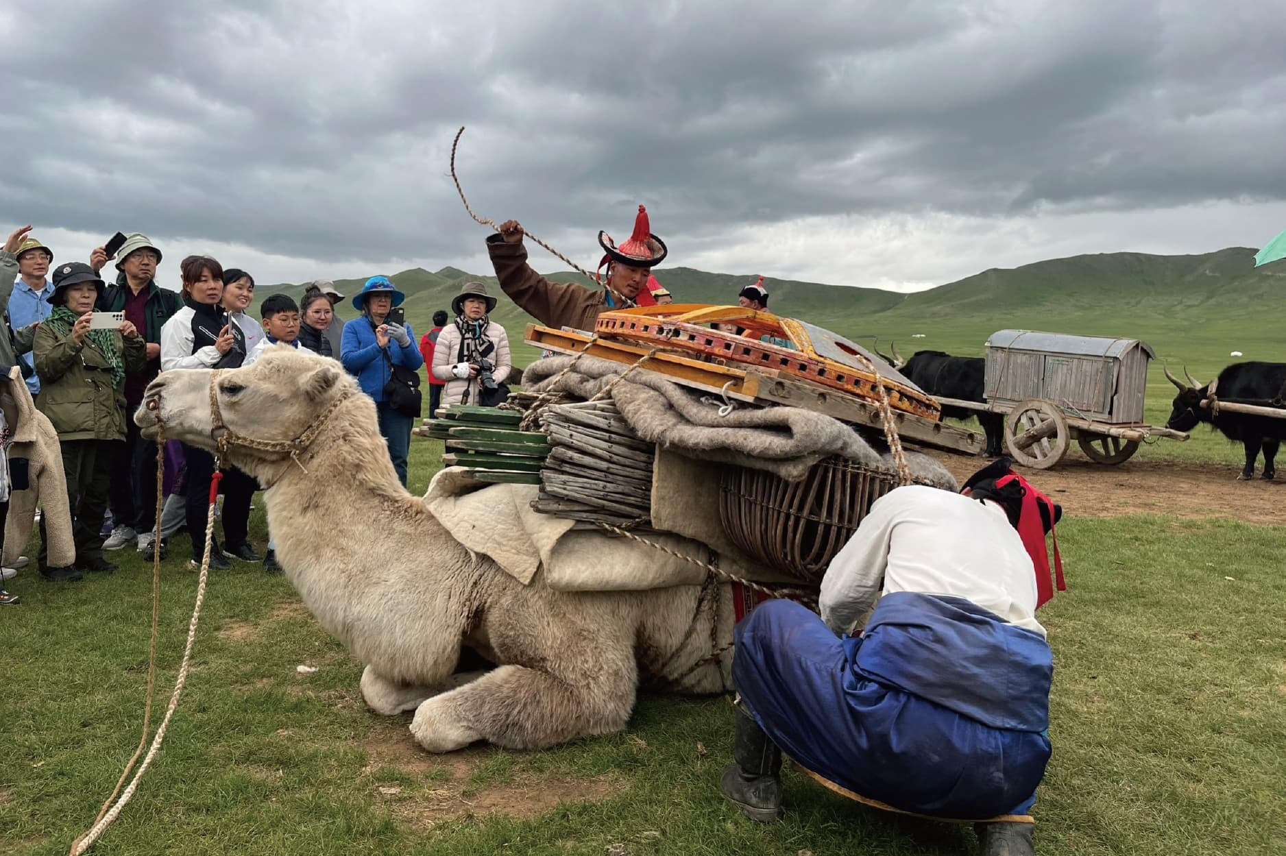 一進到園區,迎賓場面就能看到蒙古大人、小孩穿著蒙古川統服飾,騎著馬、駱駝、氂牛來迎接。「馬」在蒙古草原最普遍常見的大型動物,往北部、西部較冷的區域就能看到氂牛,而位處中部、南部雨量較少的戈壁地形能見到駱駝。多元性的交通工具,也顯示了蒙古地大物博、地貌多元的獨特性。