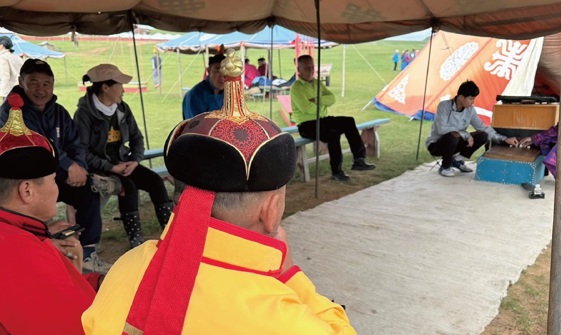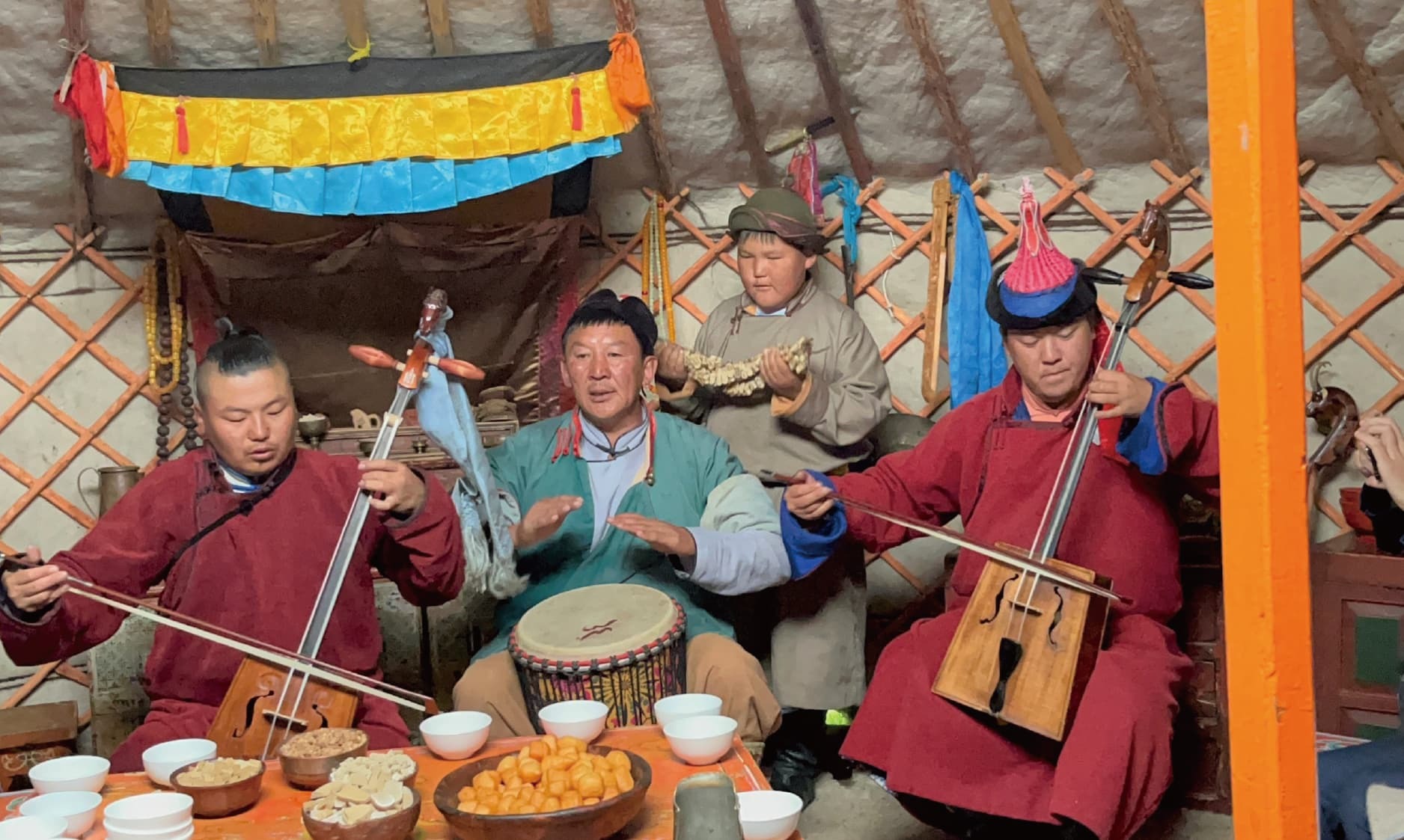 另一個最有特色的是,非物質文化遺產 -「呼麥」、「長調」與「馬頭琴演奏」。「長調」的特點是大量使用裝飾音和假聲,綿長悠遠旋律、豐富的節奏變化、極為寬廣的音域;「呼麥」是歌手純粹用自己的發聲器官,在同一時間唱出兩個以上聲部;而搭配「馬頭琴」,更能襯出廣漠大地的浩瀚,極為豐富迷人的音樂饗宴就此展開,坐在蒙古包裡,仔細聆聽,沉浸其中,一下是馬群狂奔的磅砣,一下彷彿又有氂牛低鳴節奏,歡騰熱鬧的氛圍令人難忘。