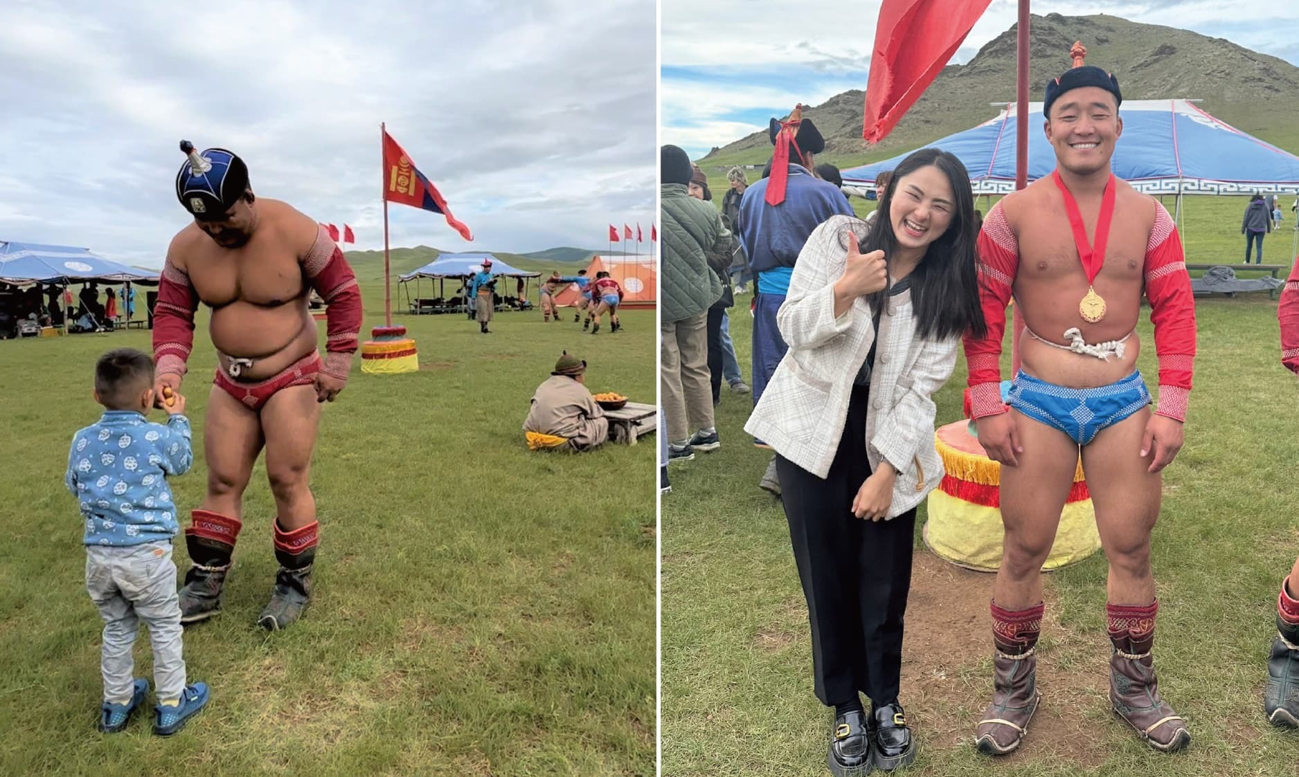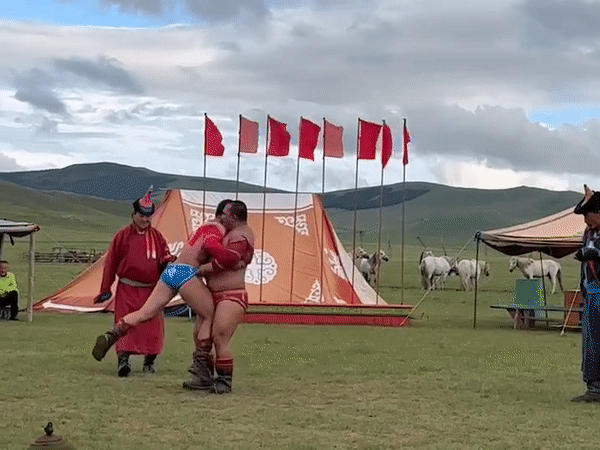 一輪比賽結束,輸者必須從贏者的手臂下穿過,贏者會繞行國旗一圈,並拿起現場的小零時分送給場邊的觀眾。有趣的是,冠軍出爐後,當天的旅客中,我竟然成了冠軍搏克選手的頒獎人,莫名尷尬又是有趣的體驗。