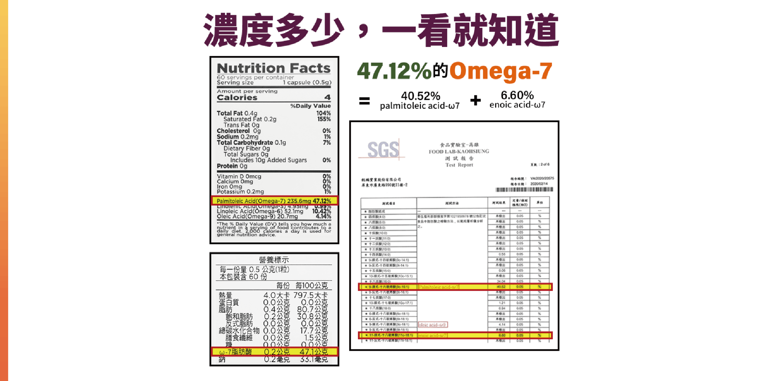 只看營養標示還不夠!最好選擇出具「Omega-7檢驗報告」的沙棘來源。目前品質不錯的沙棘油,Omega-7濃度可高達42~47%。因此,購買前看清楚標示,「ω-7脂肪酸」、「palmitoleic acid」都是指Omega-7,確認濃度足夠,才是優質的沙棘油!