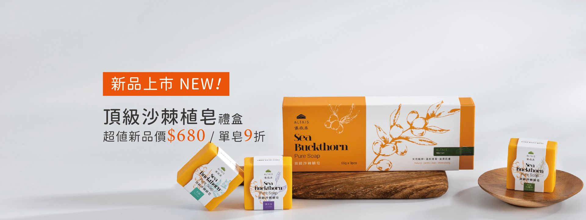即日起,頂級沙棘植皂禮盒 超值新品價$680 (原價$840)、單皂9折 $240!