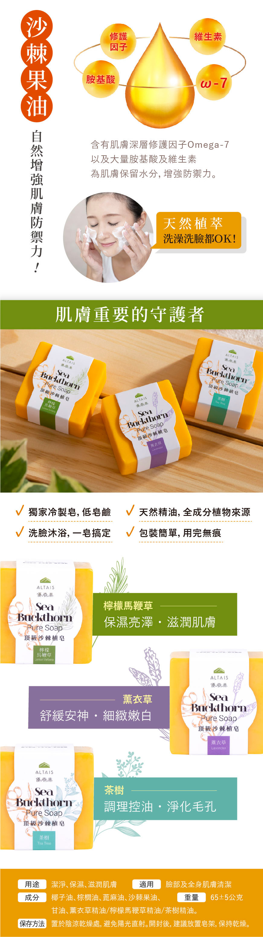 【頂級沙棘植皂禮盒內含:檸檬馬鞭草、薰衣草、茶樹,各一入。】