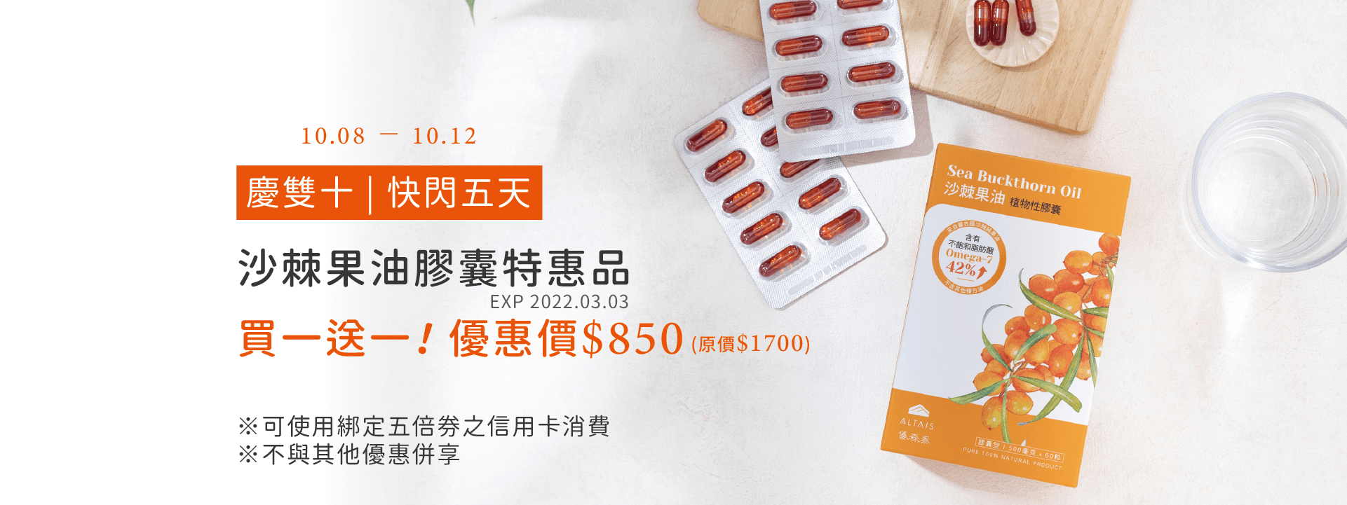 活動時間:10/8-10/12 活動內容:沙棘果油植物性膠囊買一送一,超級特惠$850(原價$1700),產品效期至2022.03.03。