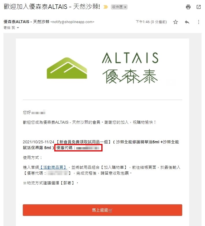 若無法登入信箱,請加入優森泰官方LINE@ (點我加入https://lin.ee/oGKLmIZ),主動傳訊告知【註冊姓名或Email】,專人將折扣碼傳送給您。