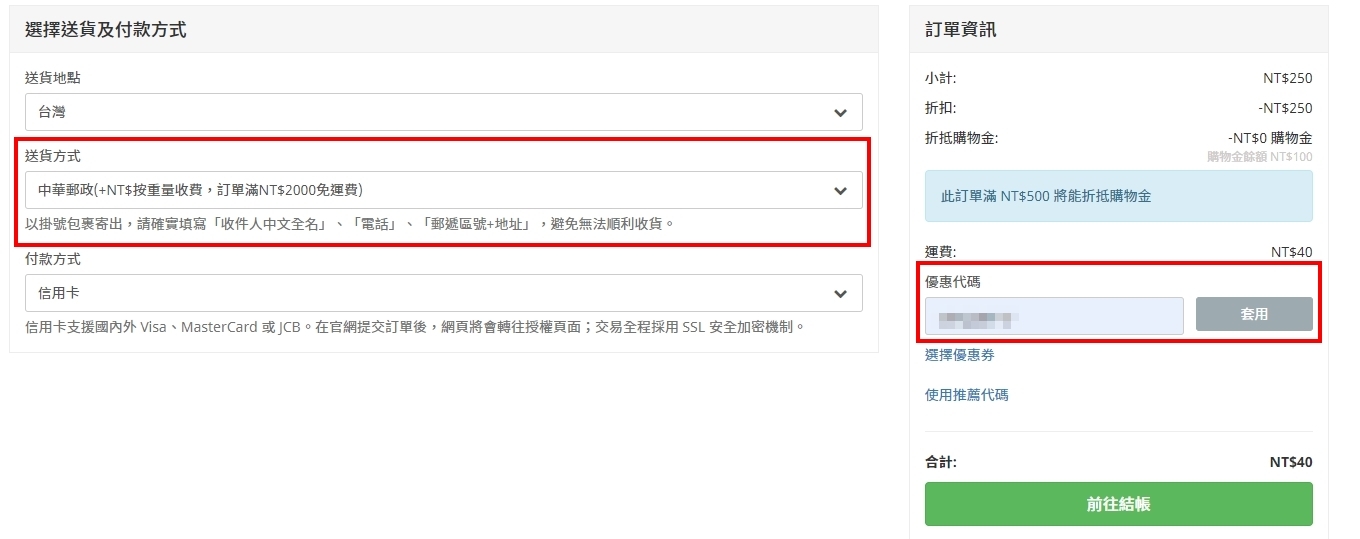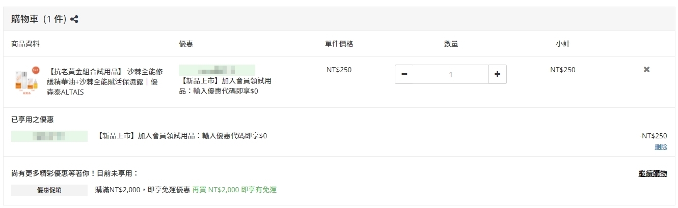 Step3. 進入官網【活動商品頁】,並將試用品-沙棘保養新品,【加入購物車】,前往結帳頁面,於最後輸入【優惠代碼】,完成流程後,請留意收取包裹。