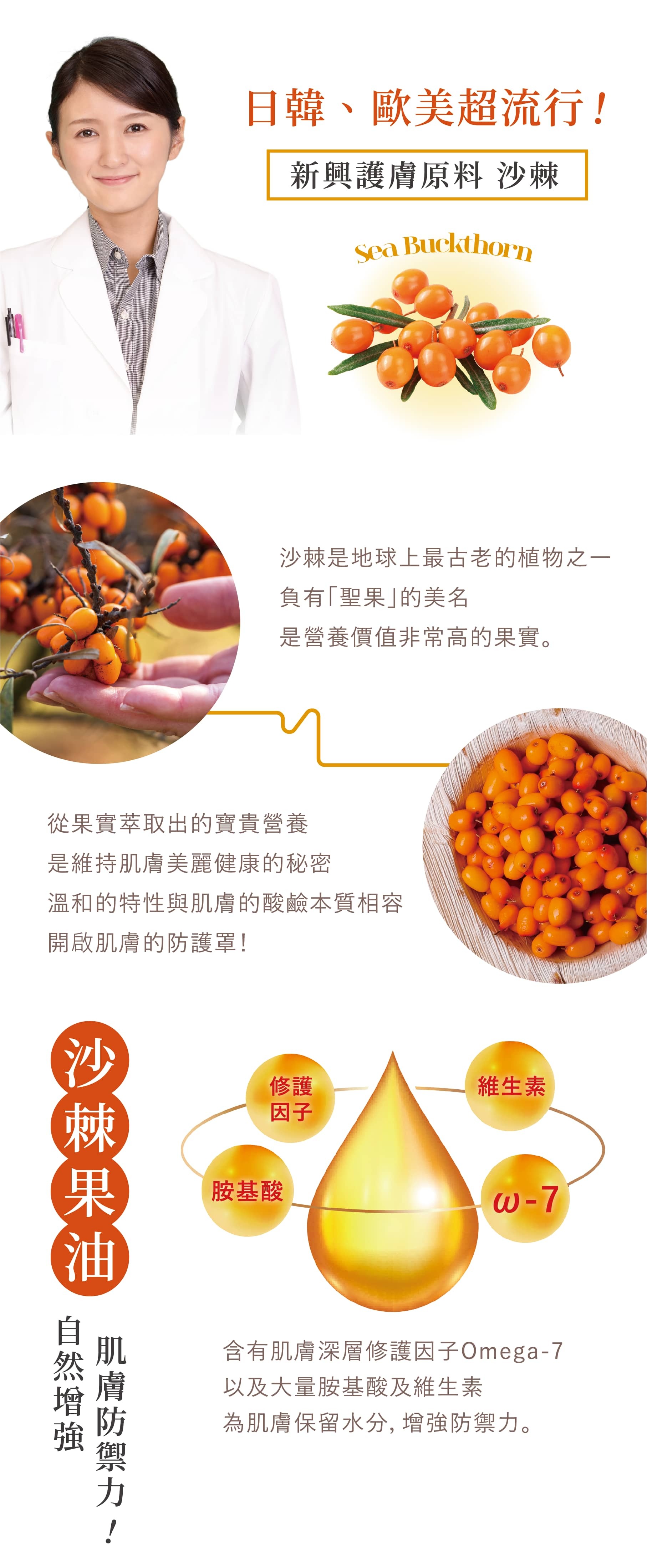 沙棘油中的豐富維生素與優質脂肪酸,有效突破老化途徑,深入真皮層撫平皺紋、緊緊鎖住肌膚水分。