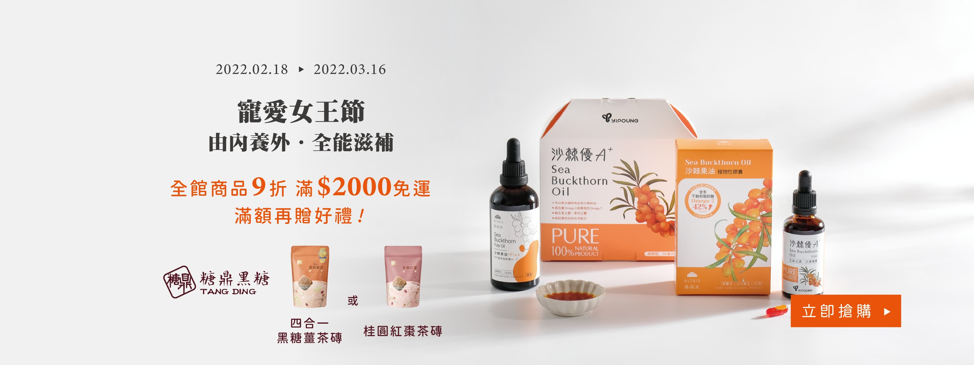 2022優森泰寵愛女王節,即日起至3月16日(三)止,沙棘商品全館9折優惠!