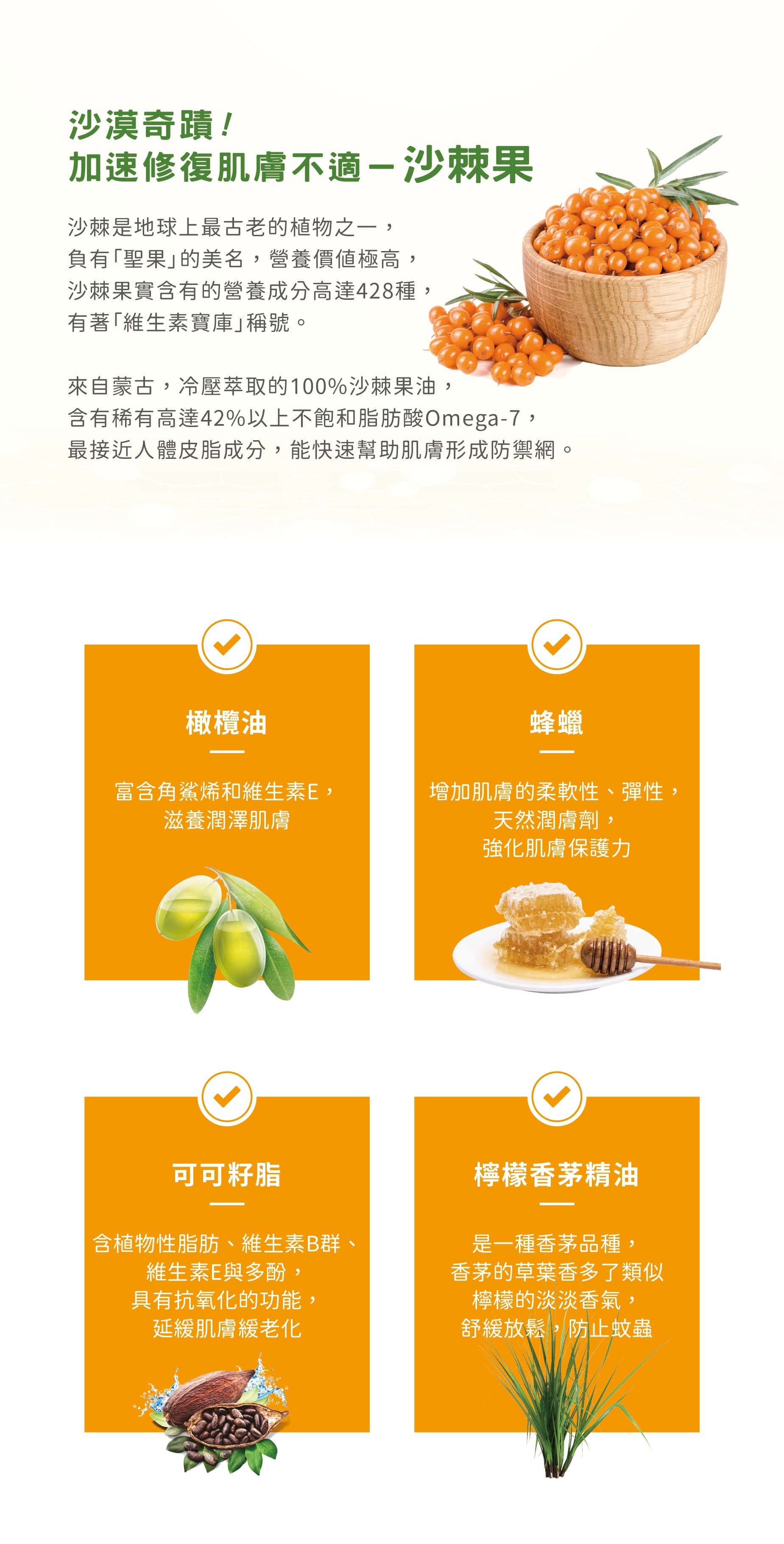 2022年沙棘全新商品-沙棘全能修護棒,含有蒙古沙棘果油高含量Omega-7脂肪酸,是極佳的肌膚修護因子,同時添加多種修護肌膚的配方成分。