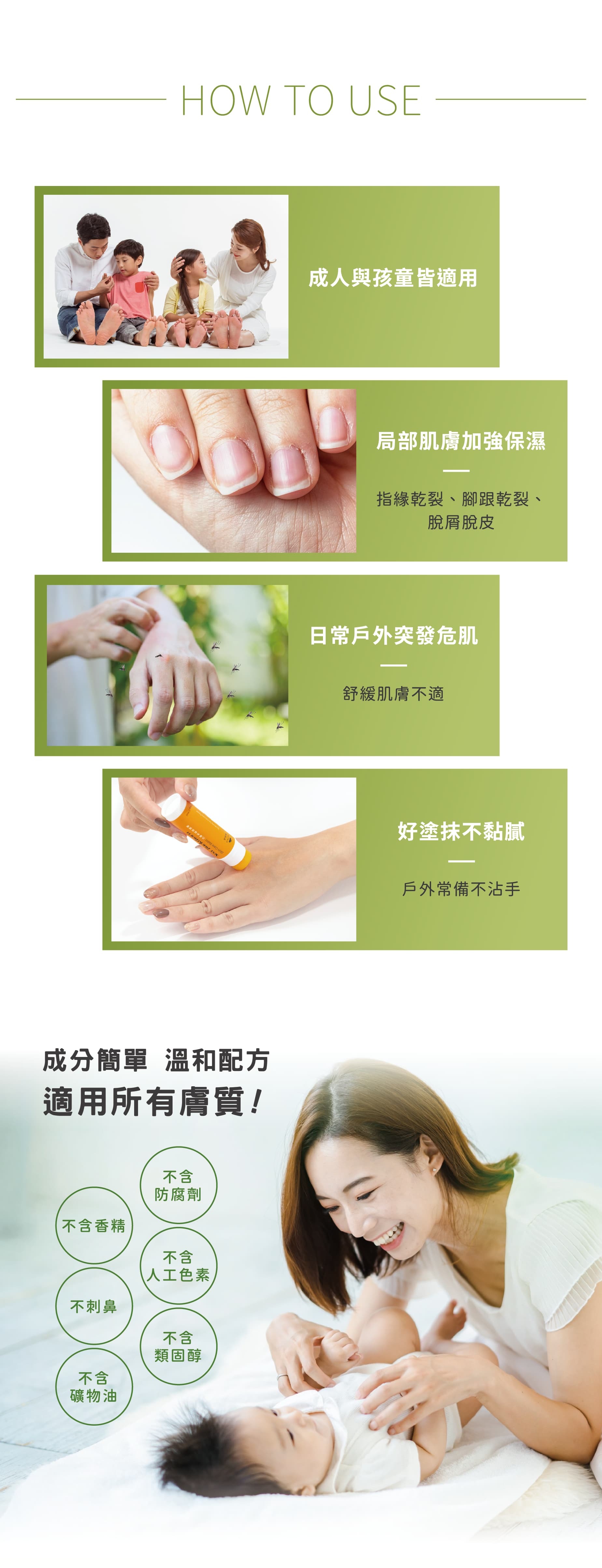 一棒萬用,方便攜帶且不沾手,可以直接塗抹在肌膚不適處,舒緩肌膚,達到修復效果!