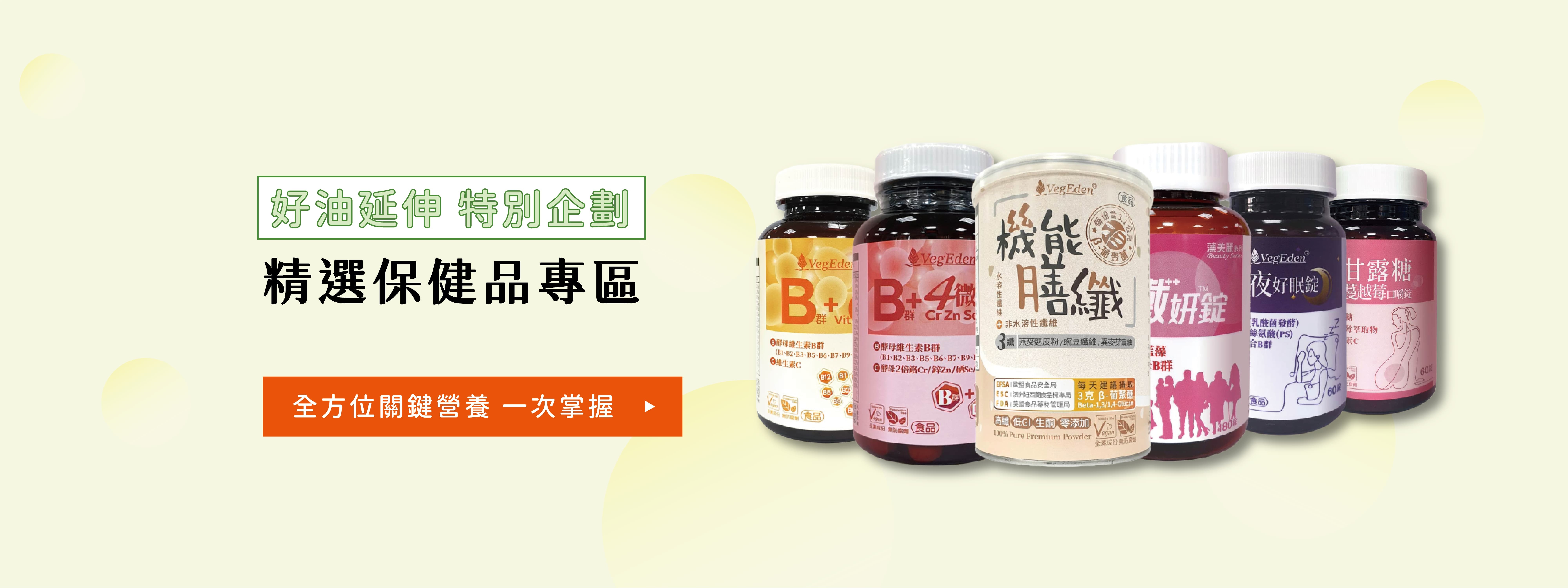 專門補「鐵」、「私密處」保養、幫助「睡眠」、超強維生素「B群」與幫助「排便」等多種全素食保健食品,可搭配沙棘油天天食用。