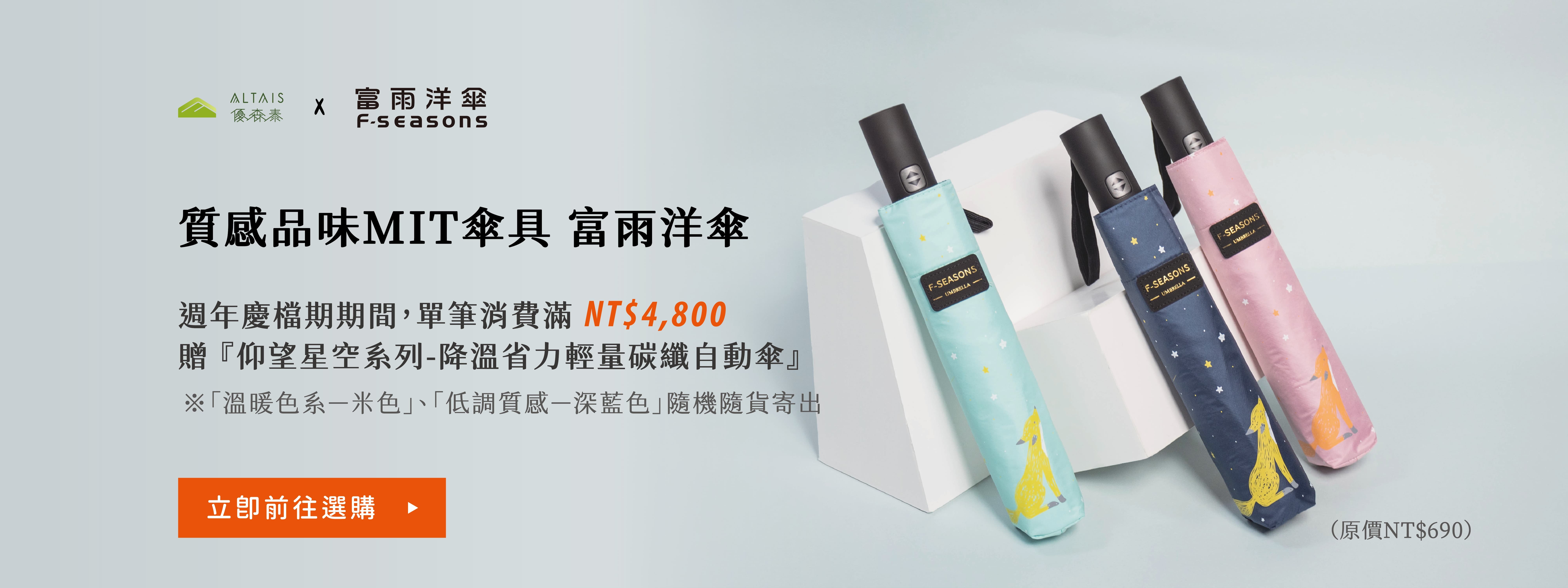 累積滿NT$4,800,加碼再贈【富雨洋傘】仰望星空系列-降溫省力輕量碳纖自動傘1支(原價NT$690),數量有限,送完為止。