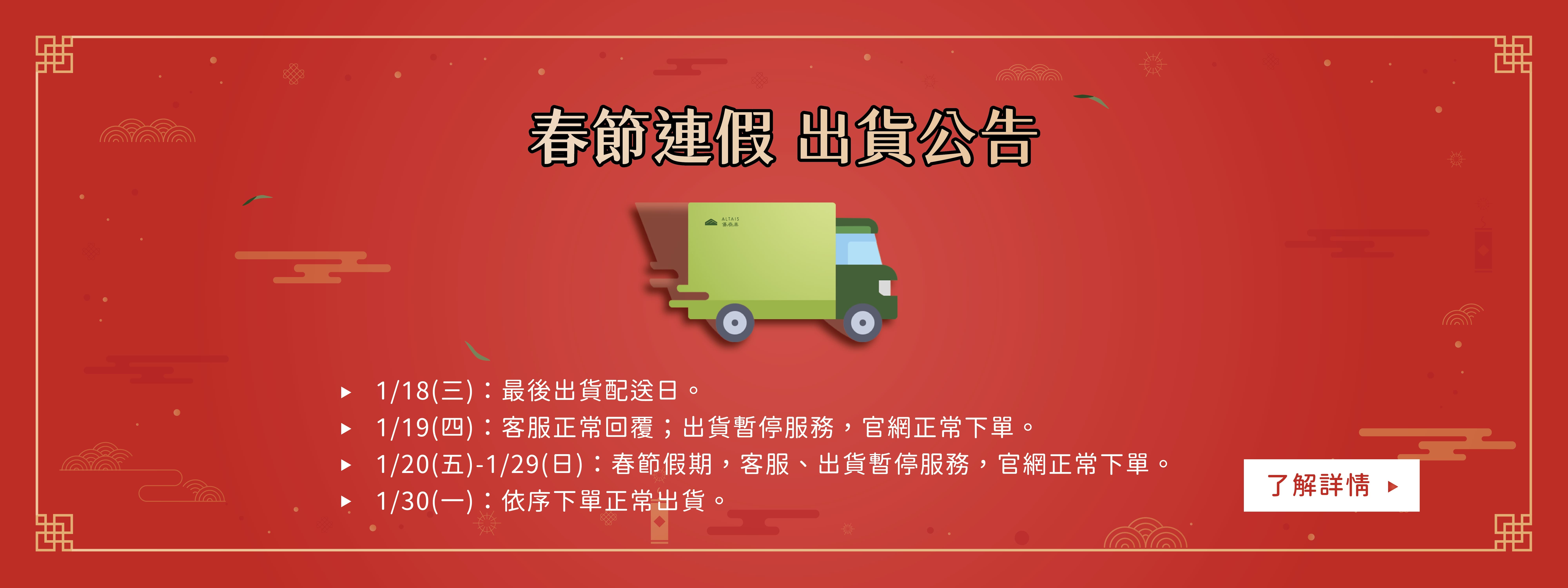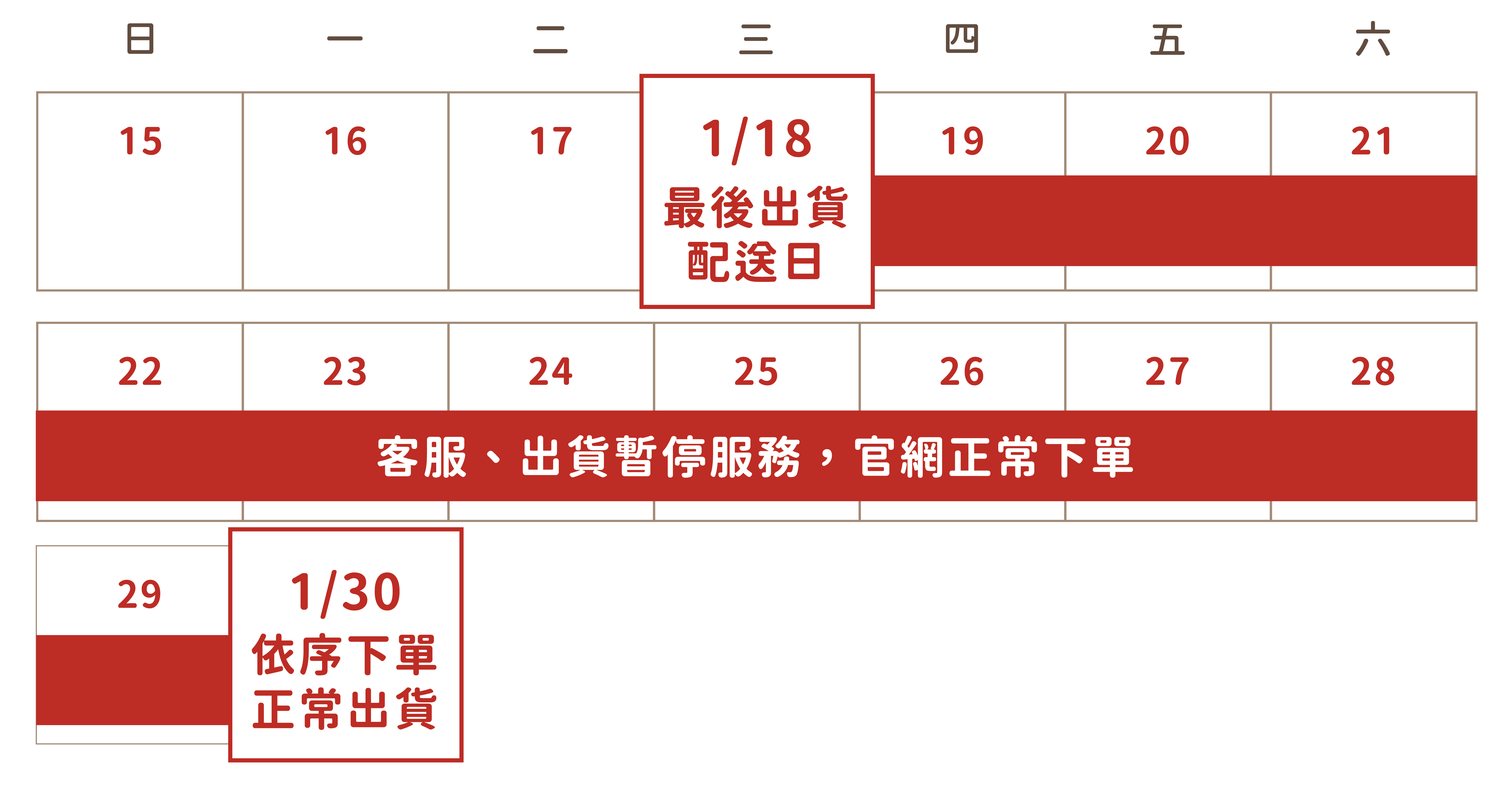 1/20(五)-1/29(日):春節假期,客服、出貨暫停服務,官網正常下單。