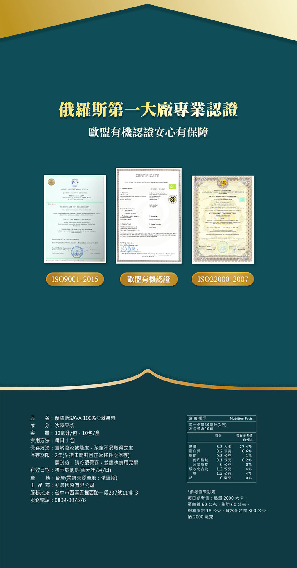 查看外包裝揭露的完整成分是否單純,是否添加過多的甜味劑。優森泰販售的沙棘原漿,產地來自俄羅斯西伯利亞,是100%沙棘原漿果汁,零添加,包留沙棘原始酸甜風味。