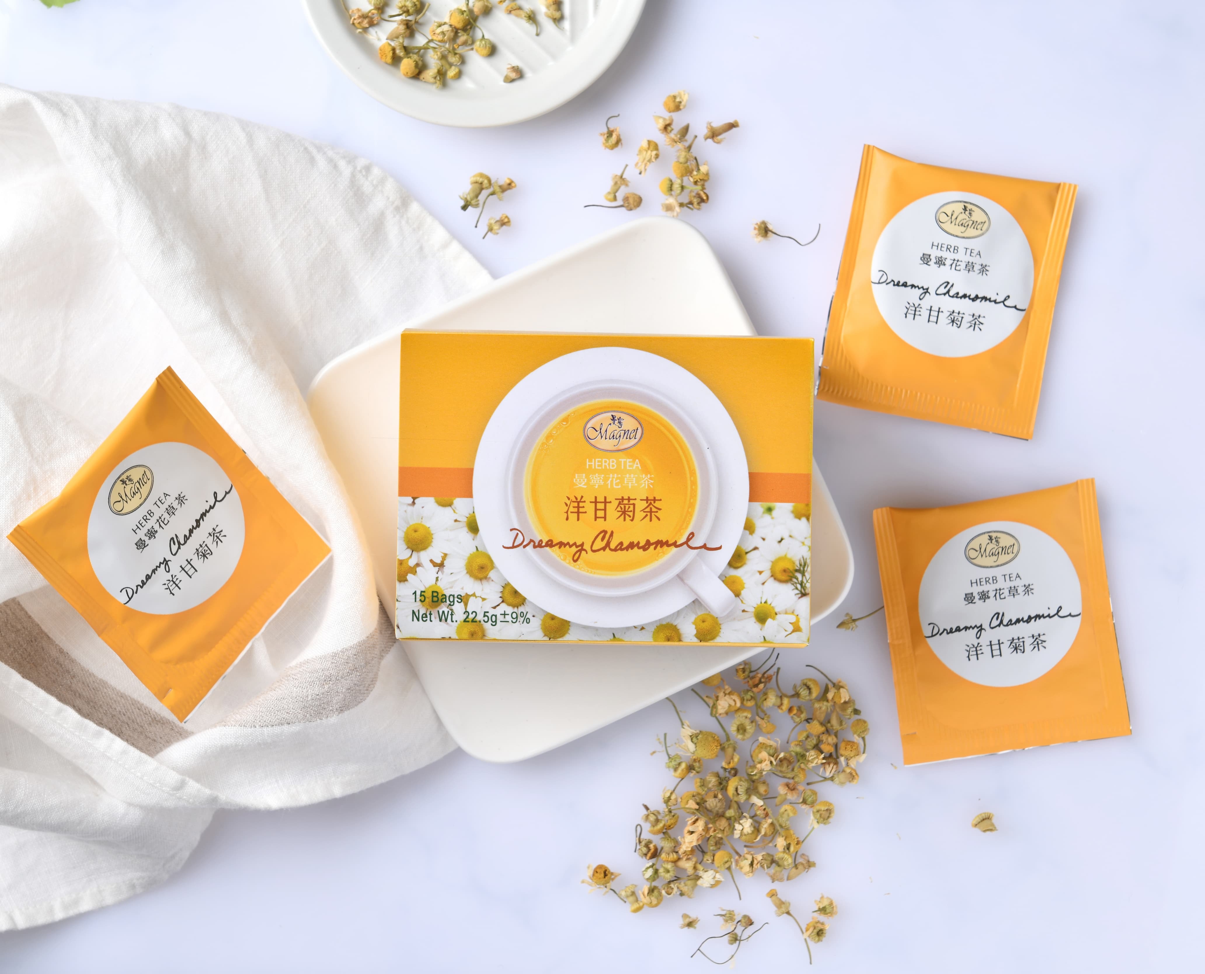 洋甘菊洋甘菊又名「大地的蘋果」,口感溫和清甜,加上含花果香氣的橙花及微甜的甘草根,適時舒解壓力。洋甘菊帶著蘋果般的甘甜與香氣具有鎮定情緒、放鬆心情、幫助睡眠的效果;橙花平衡緊張壓力,甘草成分能調和其他茶的功能;幫助放鬆。