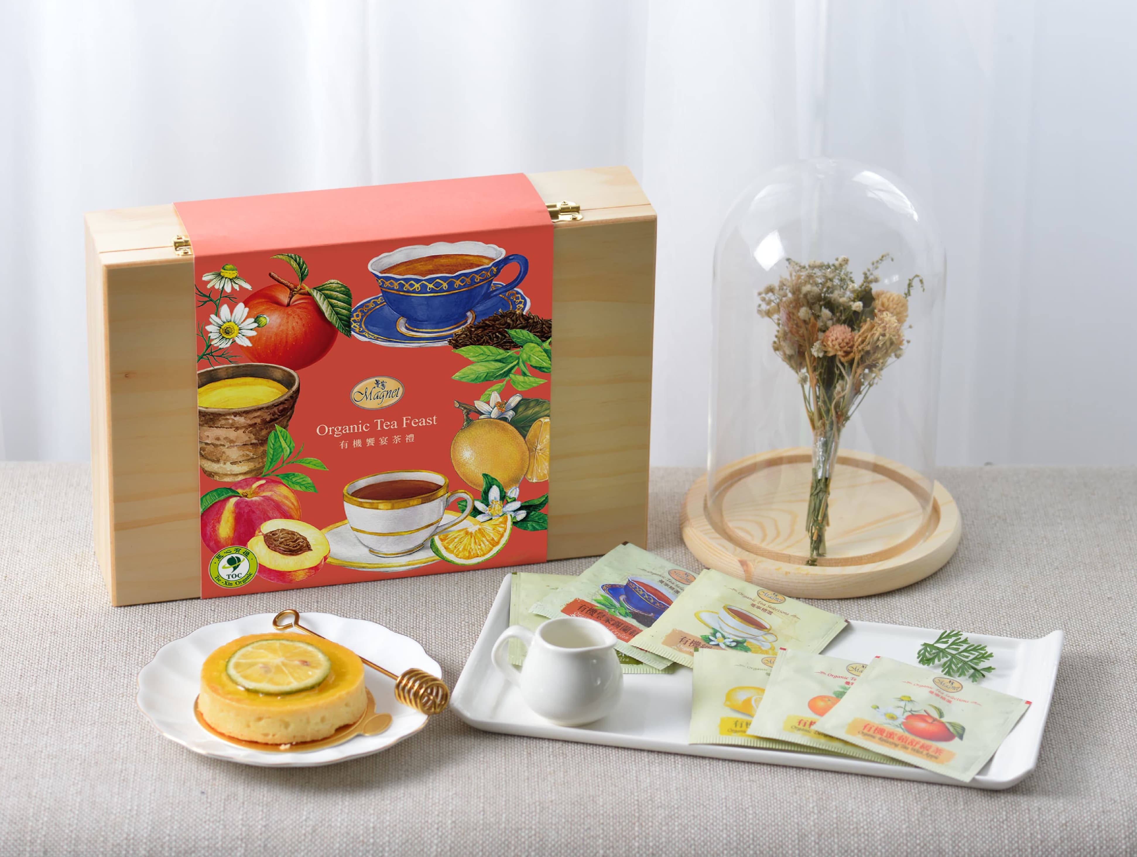 精緻松木包裝,6款茶共48入,包含有機皇家錫蘭紅茶、有機經典伯爵茶、有機經典綠茶、有機清檸康福茶、有機蜜蘋舒緩茶、有機蜜桃國寶茶,皆獲得德國與台灣慈心有機驗證。