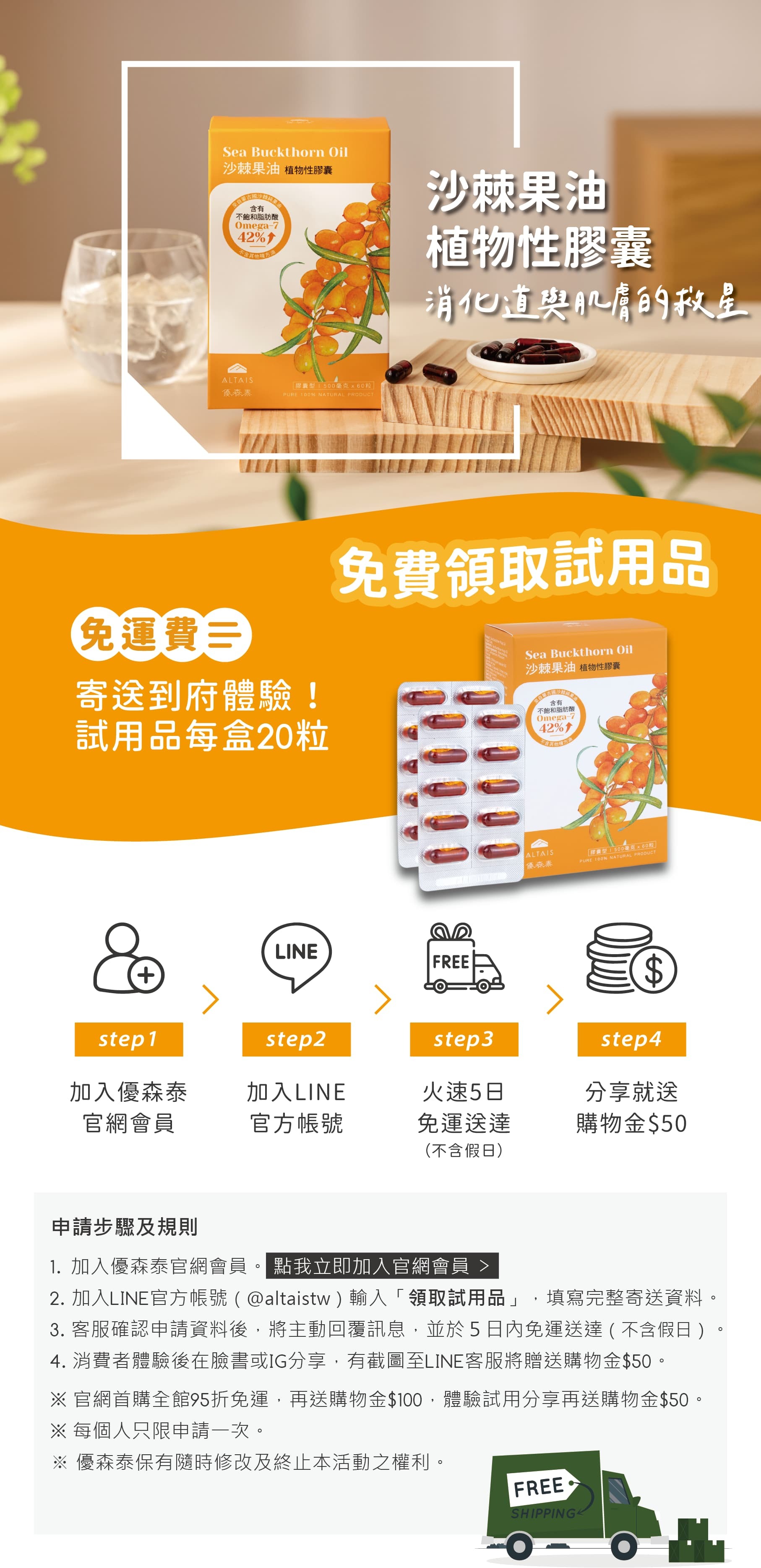 加入LINE好友 領取$50元購物金!玩遊戲加碼贈沙棘果油膠囊、沙棘精華油兌換券❣️