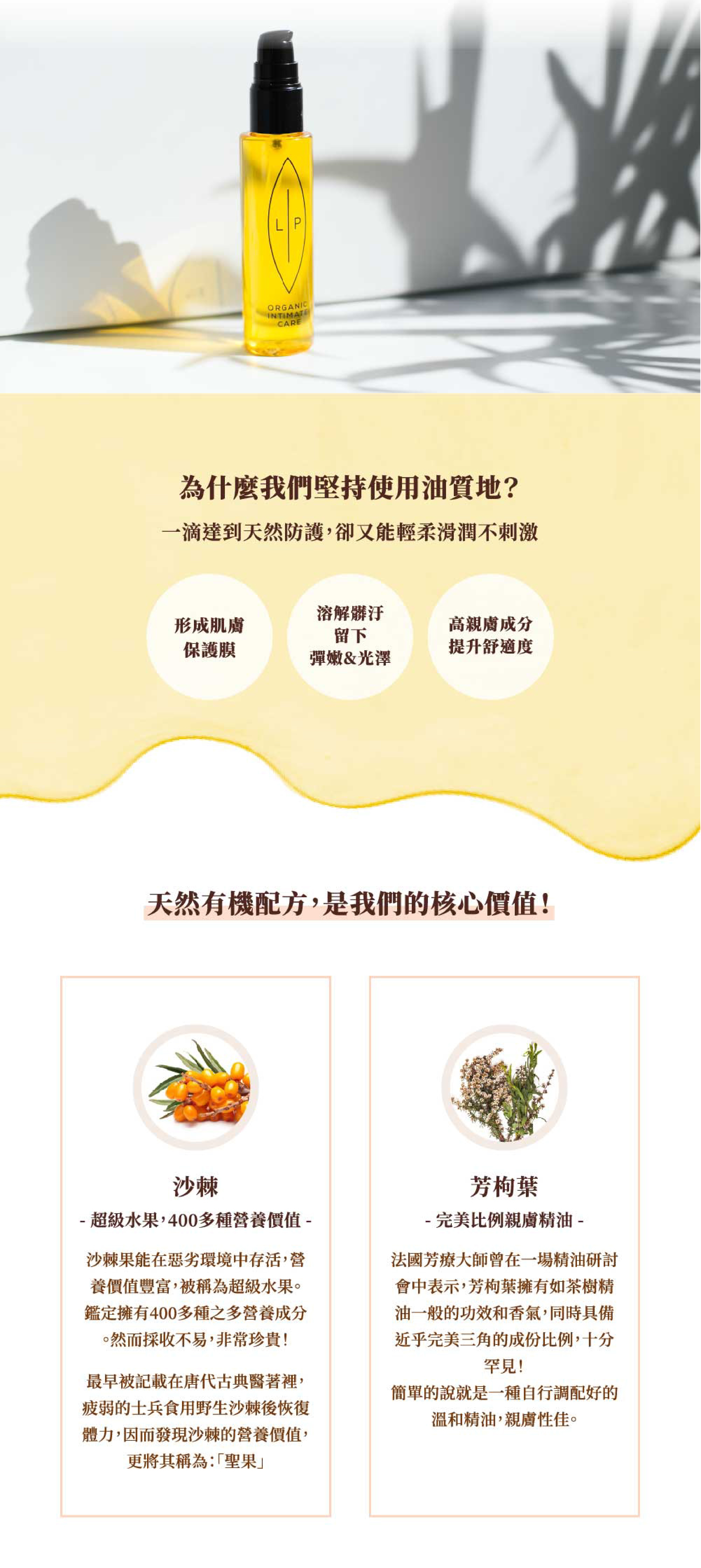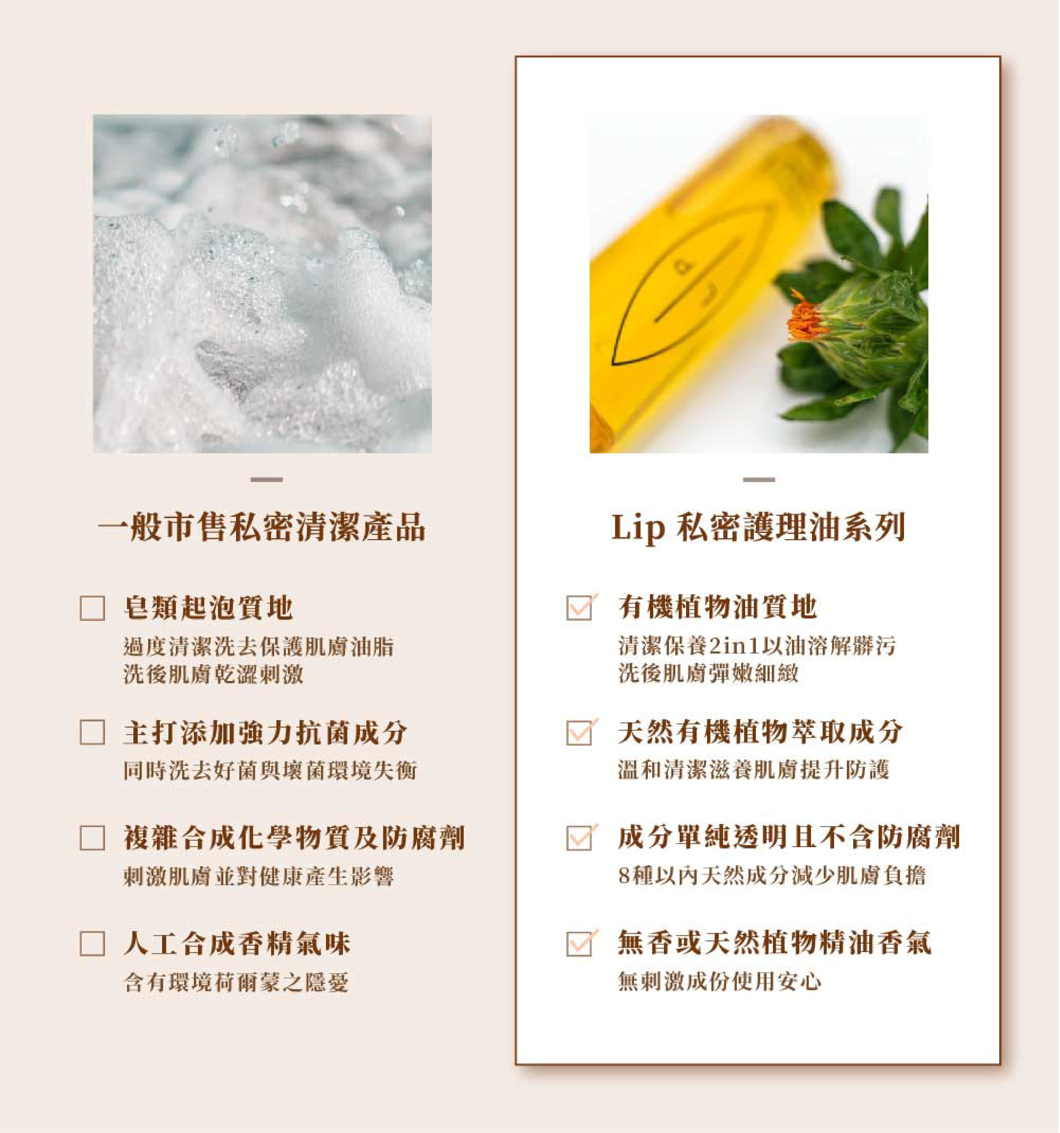 Lip Intimate Care用的是能同時達成『清潔』與『滋潤』的油質地,100%天然萃取最高等級的有機植物優油,非常溫和,不含皂鹼,不會帶走私密處必需油脂,能維持自然保護屏障。