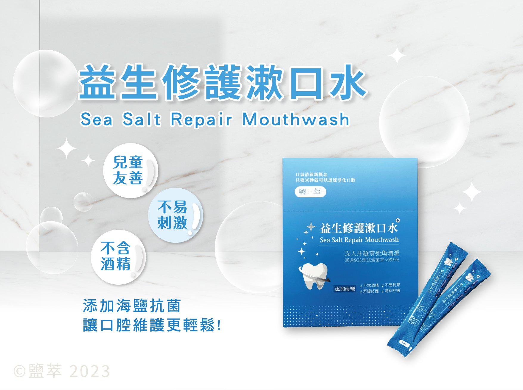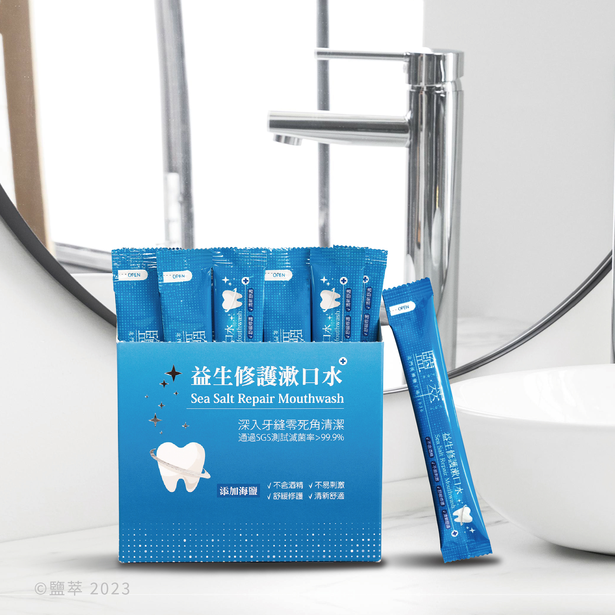 品牌主理人 - 許可,帶領一群年輕的品牌新創團隊,致力於發掘「鹽的各種可能」,其中 『最暢銷的明星商品 - 海鹽益生修護漱口水』,包裝是便利攜帶、一撕即漱的條狀隨身包,隨時保有口氣!