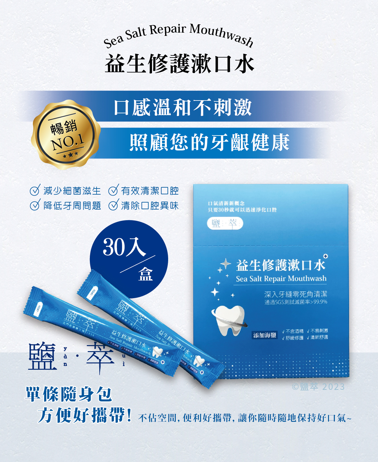 鹽萃海鹽益生漱口水與一般市面上酒精漱口水不,除了添加海鹽,還有兒茶素、薄荷衍生物、竹子萃取物等,讓牙周不適、口氣不佳,甚至是突發的約會,小小一條方便攜帶,隨拆即用,無死角清潔隨時保持好口氣!
