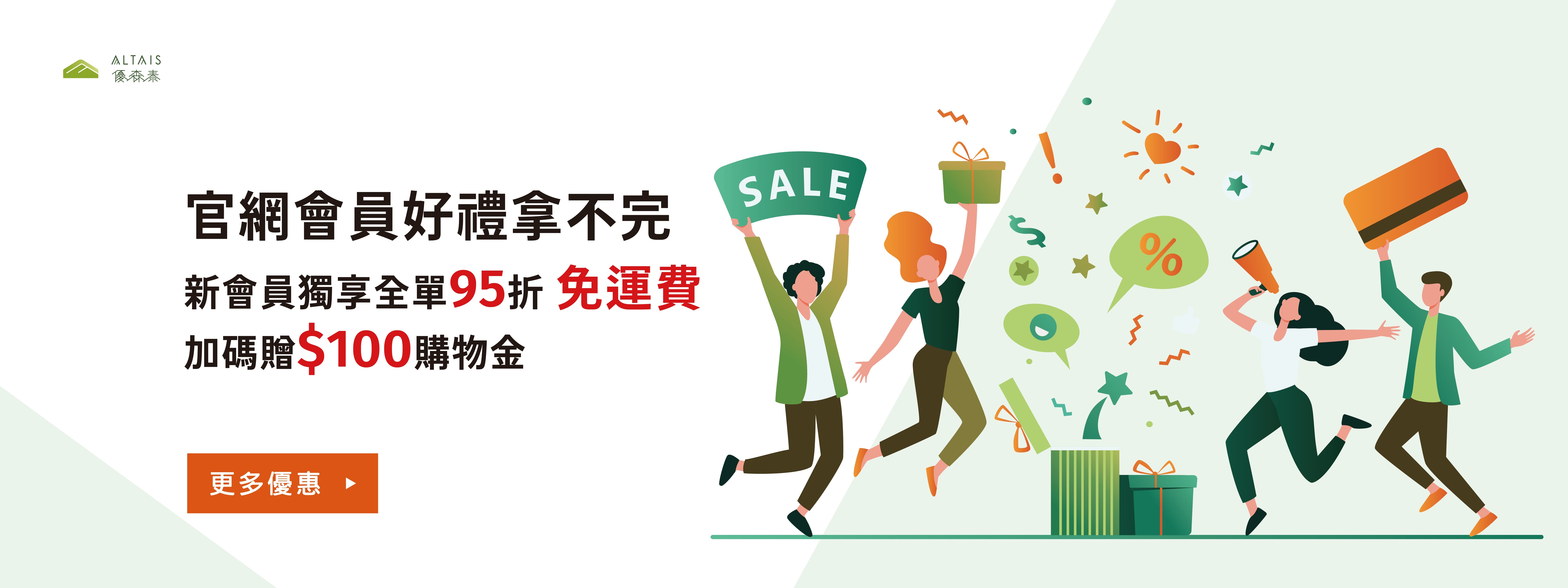 首次下單,享全館商品95折,不限金額免運費,再送$100購物金;