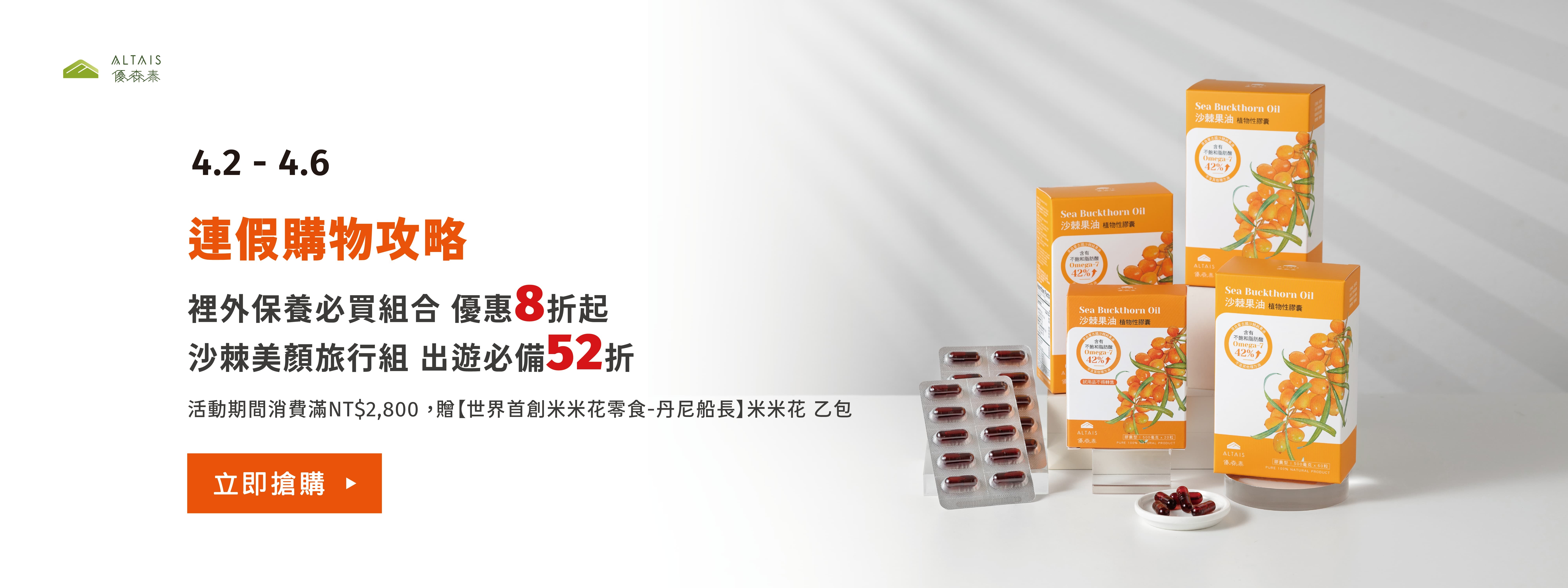 ✦【熱銷排行】沙棘果油膠囊 3盒 + 20粒 88折 NT$2,535(原價NT$2,885)