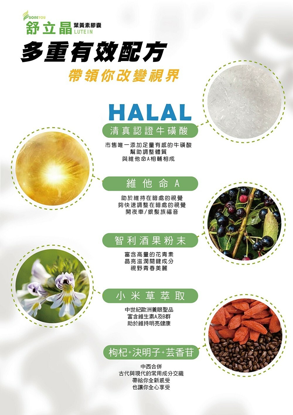 🌱 專利護眼配方,添加足量牛磺酸,HALAL清真認證