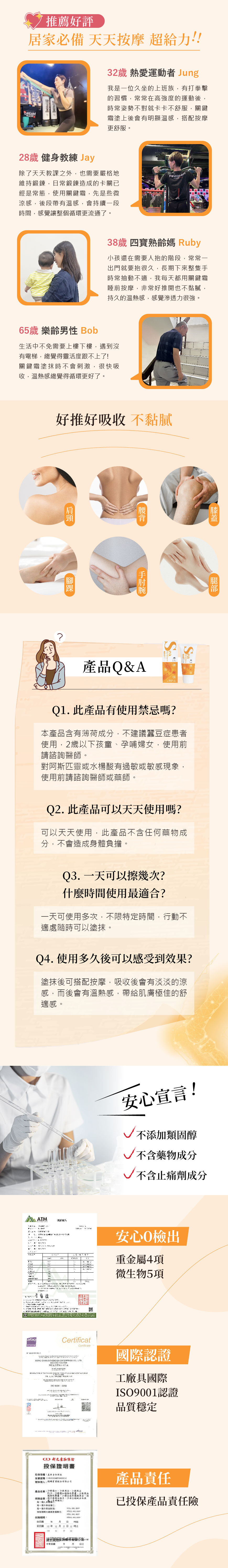 2. 本產品含有涼熱感成分,感受程度會因個人體質狀況而異,塗抹時請避開傷口處。如有皮膚異常時,請暫停使用。